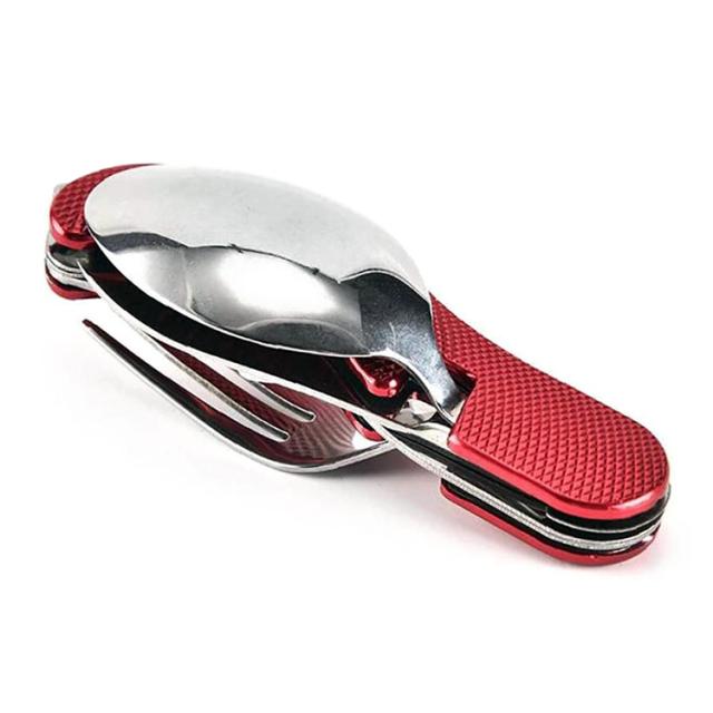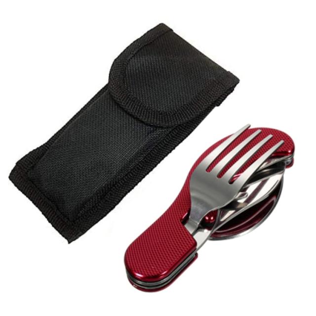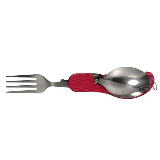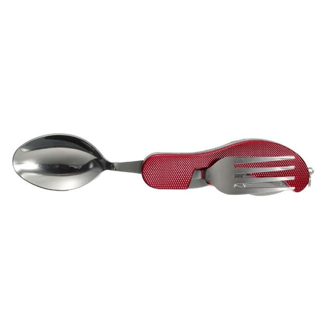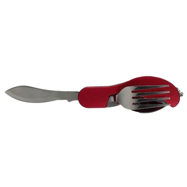 ステンレス製のフォーク スプーン ナイフ 栓抜きが一つになったマルチツール型アウトドア用カトラリーセットです。
