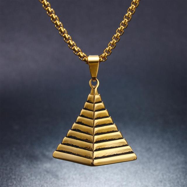 金色のミステリアスなピラミッドをデザインしたステンレスペンダントを3mmのステンレスチェーンに通したネックレス。