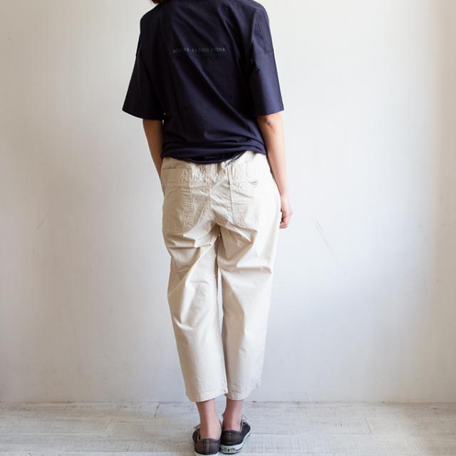 ウエストはゴム仕様で紐で調節が可能です。裾に向かってややテーパードさせているので、ワイドシルエットでも足元はすっきり。インパクトのある後ろの大きなポケットもポイントです。