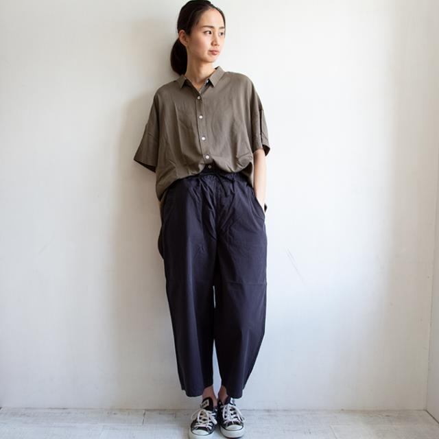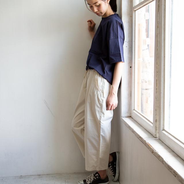 少しきちんとしたルームウエアとしても。サイズに応じて、裾を気にせずはける9分丈が嬉しい。 高密度な平織素材で独特なハリ感のあるワイドパンツ。 |