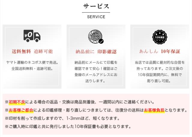 お客様が当店にてお買い上げいただいた印鑑は、ご購入日より、10年以内であれば、無料で彫り直しをいたします。(送料は往復分ご負担ください。)