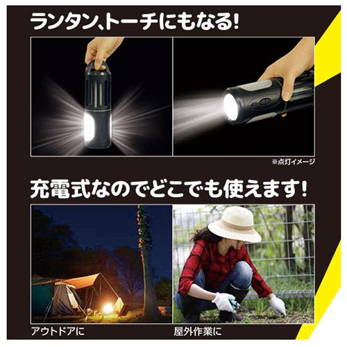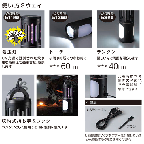 ●UV光源で誘引された蚊や虫を高電圧で感電させ駆除する殺虫灯、夜間や暗所での移動時に便利なトーチ、優しい光で周囲を照らすランタンの3ウェイで使用できます。
