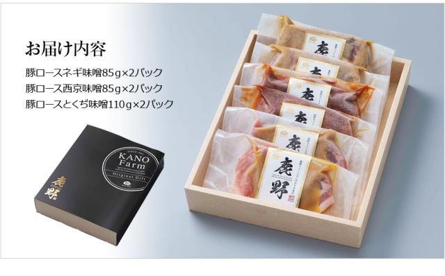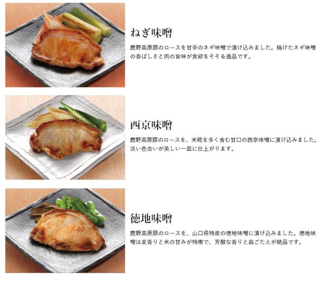 豚ロースネギ味噌85g×2パック、豚ロース西京味噌85g×2パック、豚ロースとくぢ味噌110g×2パック