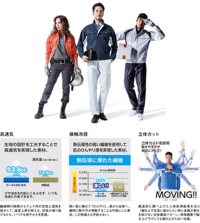 マルチ機能を搭載した多機能作業服。バイカラーデザインで上下別色のコーディネートもできます。