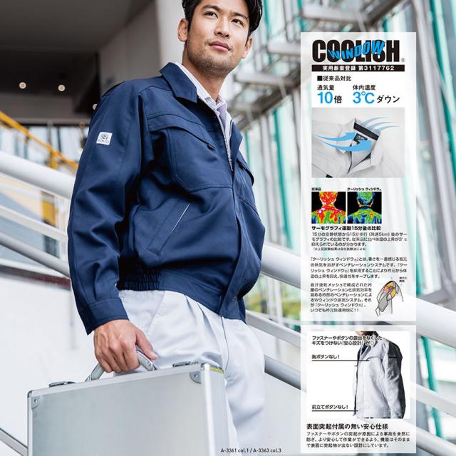 左右胸ポケット(巾15cm×深さ15cm)、樹脂ドットボタン、携帯電話収納ポケット、左袖反射パイピング付ペン差し、衿台吸汗速乾メッシュ、クーリッシュウィンドウ