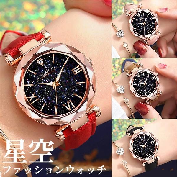 レディース 女性用 アナログ 腕時計 クォーツ ファッションウォッチ 星空 宇宙 キラキラ ラメ 女性用 革バンド レザーバンド ローマ数字 夜光針 ルミナスハンズ