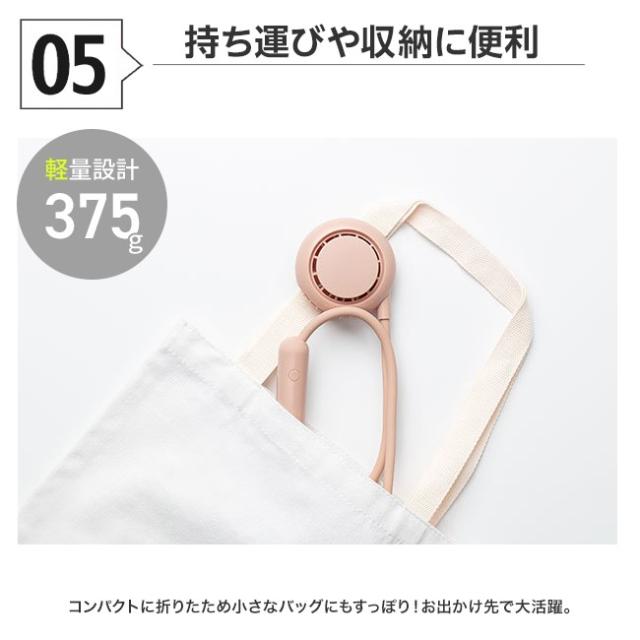 正面から風が出る従来の首掛け扇風機とは違ってファンの側面部分から風が出るので、顔に向けて角度を調整する必要がなく、首にかけるだけですぐに使える!