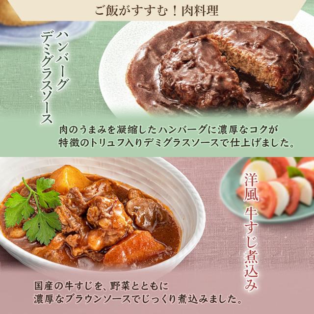野菜 肉 魚 の 煮物 おかず や ハンバーグ 肉じゃが 煮魚 と 和食 や 洋食 お惣菜 の種類がいっぱい。常温保存 出来て レンジ 湯煎 で 温めるだけいつでも お手軽 簡単 調理 レンジ対応 パウチ もあって 便利 !