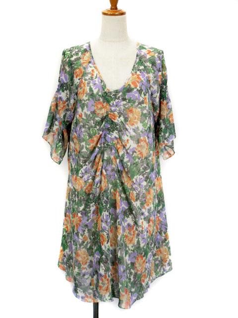 【中古】カーライフ carlife ワンピース フレア Vネック 花柄 ギャザー シフォン ベージュ レディース