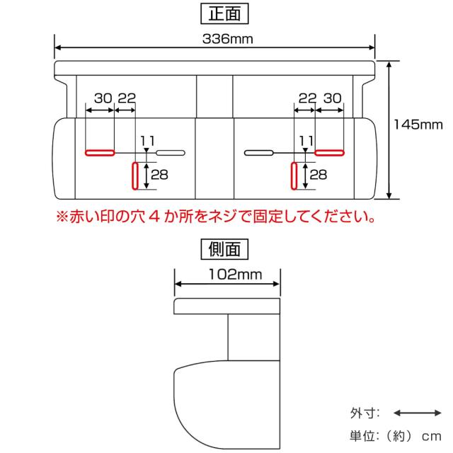| 備考 | 芯あり・なし兼用 ※ペーパーの外径が12cm以上のトイレットペーパーは使用できません。 ※棚には1kg以上のものは置かないでください。 |
