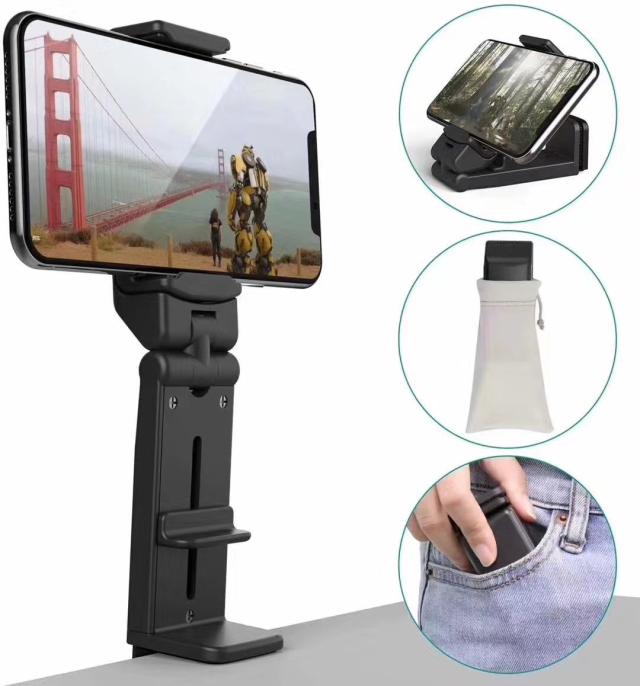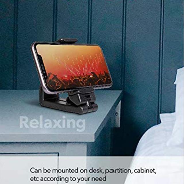 伸縮するクリップで簡単にスマホを取付け可能、クリップで挟めるところへ自由に設置できます。