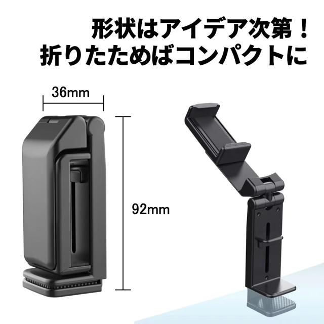 | 折りたたみ時:約(縦) 92 mm (横) 36 mm (幅) 36 mm 重 量 : 94.9グラム 最大開閉時:約(縦) 220 mm スマホ固定幅:約85mmまで対応 固定クリップ幅:約35mmまで対応 ※スマホケースの装着は推奨しておりません。 |