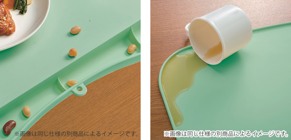 | 食べこぼしをキャッチ テーブルにピタッと密着し、食べこぼし等をしてもポケットが付いているのでしっかり受け止めます。 | フチ付きで汚れても安心 まわりにフチが付いているので、テーブルが汚れるのを防ぎます。万が一、飲料をこぼしても安心です。汚れてもサッと丸洗いできるのでお手入れも簡単です。 |