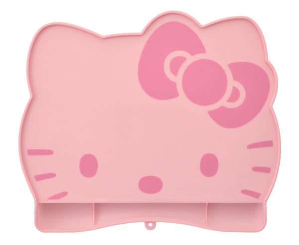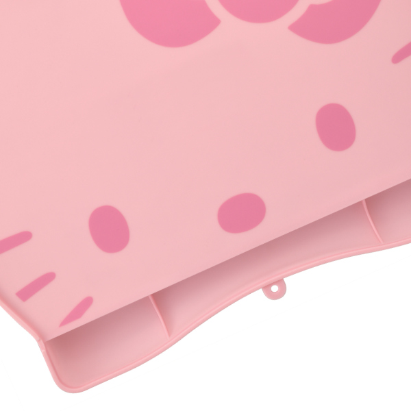 ハローキティの形をしたとても可愛いお食事マットで毎日楽しく食事ができます。身体にやさしいカーブ形状でテーブルにピタッと密着して滑りにくいです。食べこぼしをキャッチするポケットとまわりにフチが付いているのでお子様がお食事の際にこぼしても安心です。シリコン製で水洗いができ、便利な吊下げ穴も付いています。丸めてコンパクトに収納できます。