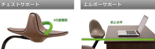 | お好みの角度で使える 仕事中や勉強中、胸を当てる事により使用者の背筋が曲がる事を防ぎ、休憩時には後ろに回して背もたれとして使えます。 | 肘を支え肩や首の疲れを軽減 肘と机の高さを水平にすることで、机上での作業時でも姿勢を安定させ、集中力を高めます。 |