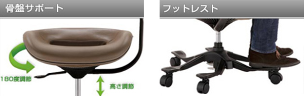 | 正常な腰の曲線を維持 ヒップと骨盤を支える形をしており、背中が理想的なS字になるよう助けてくれます。 | 理想的な脚の角度を維持 イスに座ってフットレストに足を置くと膝との理想的な角度を維持し楽にしてくれます。 |