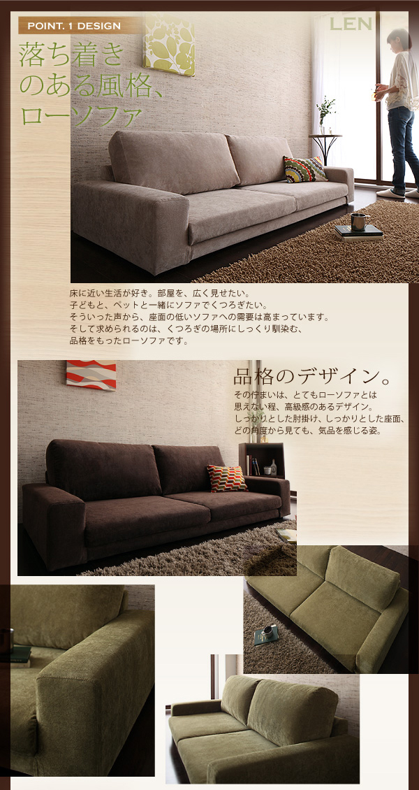 床に近い生活が好き。部屋を、広く見せたい。子どもと、ペットと一緒にソファでくつろぎたい。そういった声から、座面の低いソファへの需要は高まっています。そして求められるのは、くつろぎの場所にしっくり馴染む、品格をもったローソファです。その佇まいは、とてもローソファとは思えない程、高級感のあるデザイン。しっかりとした肘掛け、しっかりとした座面、どの角度から見ても、気品を感じるフォルムデザイン。そして日本人の心、炬燵。その伝統のアイテムと、このソファは、相性ぴったりです。ただソファを置くだけで、更に寛ぎの空間へと誘います。