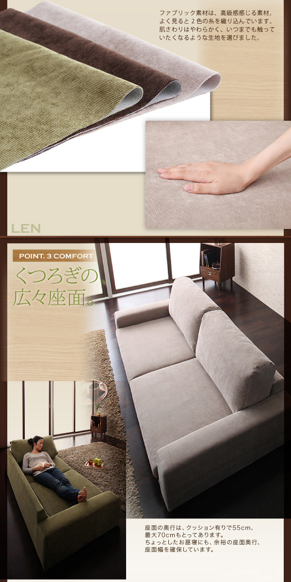 座面の奥行は、クッション有りで55cm、最大で70cmもとってあります。ちょっとしたお昼寝にも、余裕の座面奥行、座面幅を確保しています。背もたれはセパレートなので、 自分のお好みの角度に調節できます。背もたれは、寄りかかった時にやわらかさを感じられるような、ふかふか感。中材としてポリエステルわたをたっぷりと詰めています。