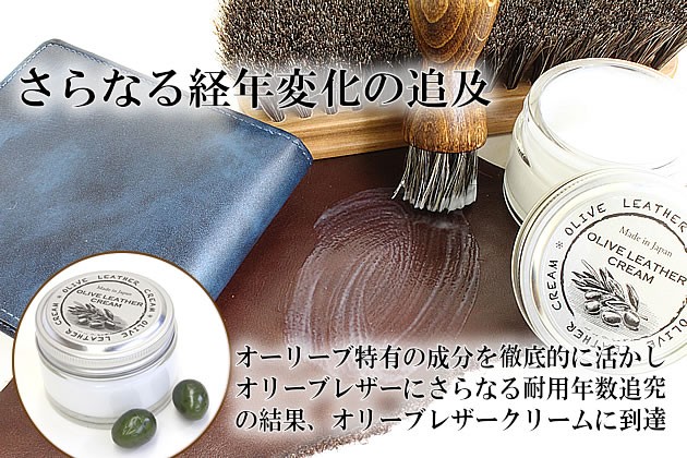 オーリーブレザーと併用してオリーブレザークリームを使いメンテナンスすることでタンニンレザーの持つ経年変化をより長くお楽しみ頂けます。