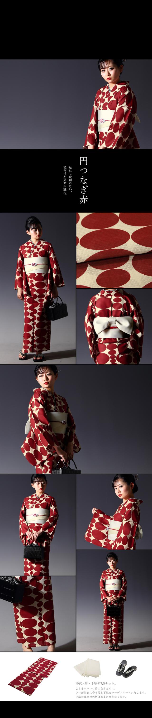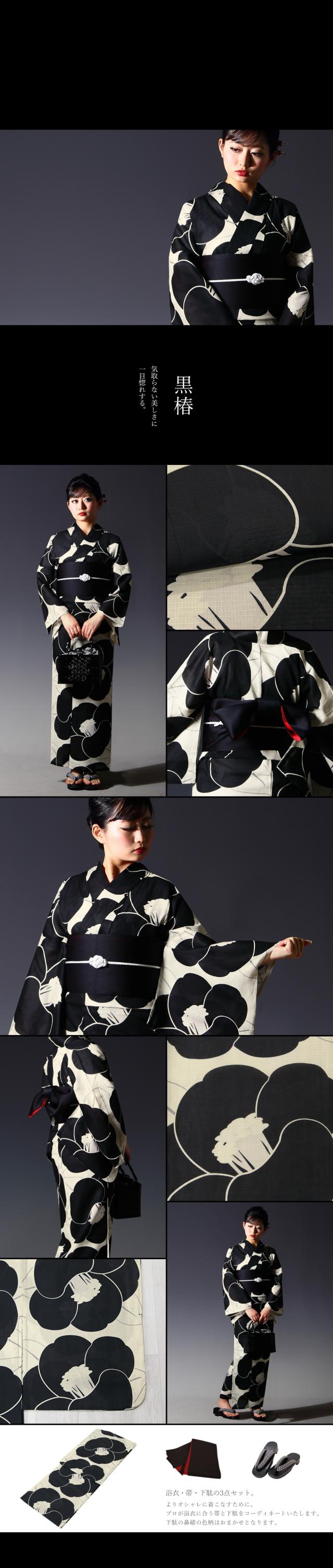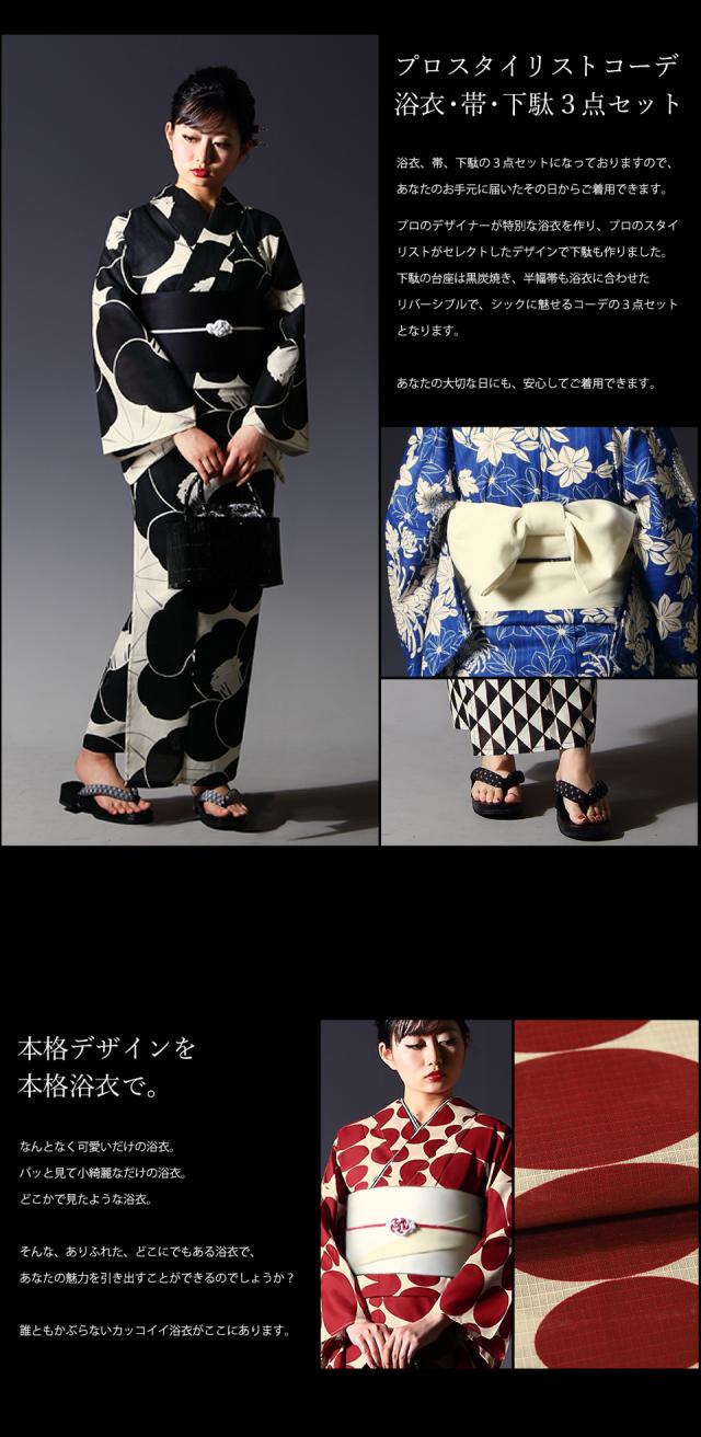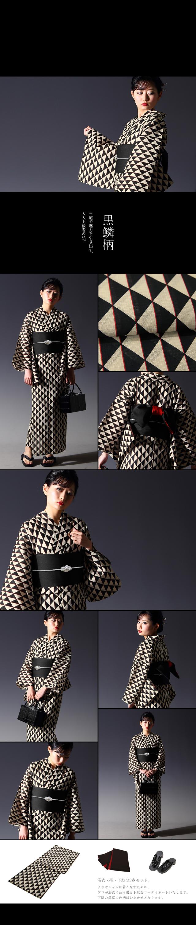 浴衣3点セット(浴衣+帯+下駄)フリー ゆかた モダン かっこいい 水玉 鱗 幾何学 椿 花柄 黒 白 赤
