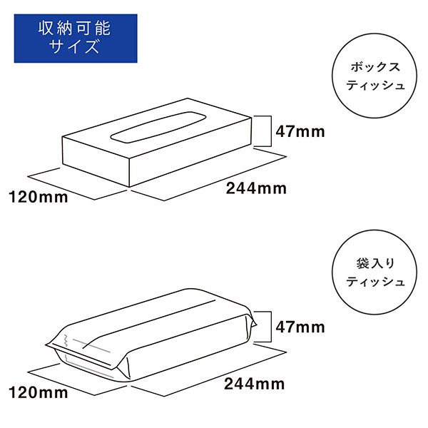 袋入りティッシュの収納可能サイズ 縦120×横244×高さ47mm以下のティッシュがそのまま入ります。