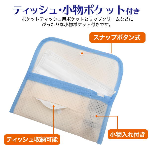 ポケットティッシュ用ポケットとリップクリームなどにぴったりな小物ポケット付きです。