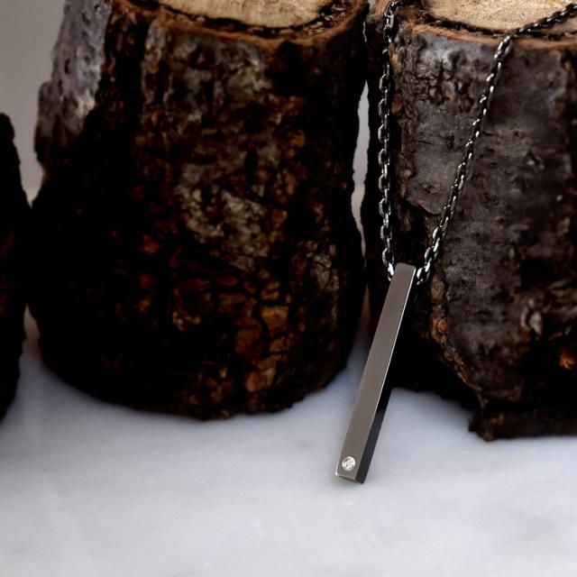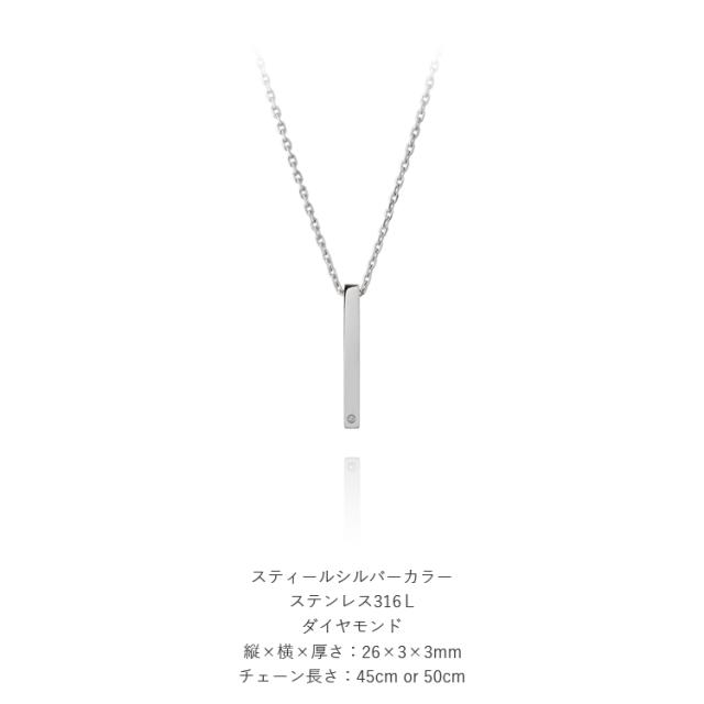 スティールシルバーカラーのシンプルな角柱デザインにダイヤモンドをあしらった、究極の洗練ネックレス。