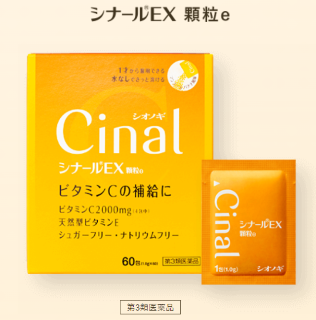 | 人は、体の中でビタミンCをつくることができないため、毎日摂取することが大切です。 シナールEX顆粒eは、ビタミンCの補給に適したビタミン剤で、口の中でさっと溶けるのみやすい顆粒です。ビタミンCとともに、抗酸化作用をもつ天然型ビタミンE、皮ふの正常な働きをサポートするビタミンB2を配合しています。 | ||||||||||||||||||||