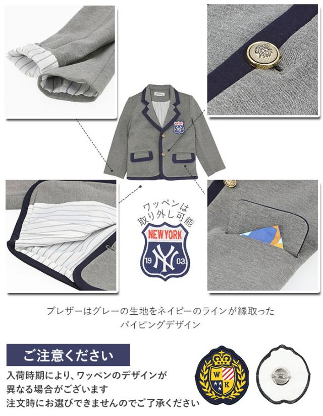 | 商品説明 | ・ガールズもボーイズも、ちょっと大人っぽく制服風コーデができちゃう♪キッズフォーマルスーツ。 ・ブレザーはグレーの生地をネイビーのラインが縁取ったパイピングデザイン。裾の丸いフォルムや金ボタンがアクセント。 ・ブレザーに付属のロゴワッペンは安全ピンで取り外しが可能。ワッペンなしのシンプルな雰囲気も楽しめる。 ・男女ともお揃いのシャツは、ブルーのストライプに襟と前合わせのホワイトのラインの組み合わせがとっても爽やか♪ ・ガールズのボトムスには、タータンチェックが可愛いスカート。ウエストゴムタイプにインナーパンツ付きで安心して履ける。 ・ボーイズのパンツは、シンプルながらもダブル裾仕上げの高級感ある仕上がり。ポケット開口部の生地を切り替えているところがオシャレ。 ・男女共にゴムで簡単に着用できるキュートな蝶ネクタイ付き。兄妹やお友だちとシミラールックでキメたいときにオススメのフォーマルセット♪ |