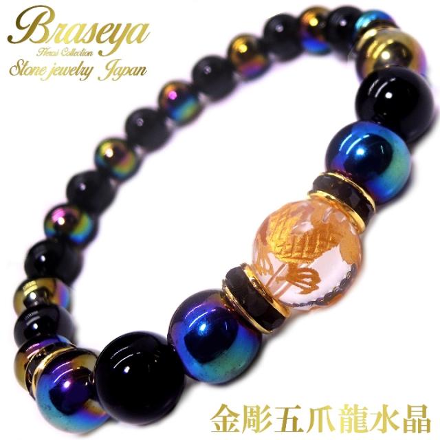 【送料無料】金彫 五爪 龍 水晶 12mm オーロラ オニキス ブラックオニキス パワー ストーン ブレスレット 内周約17cm メンズ 天然石 ♪ 彫