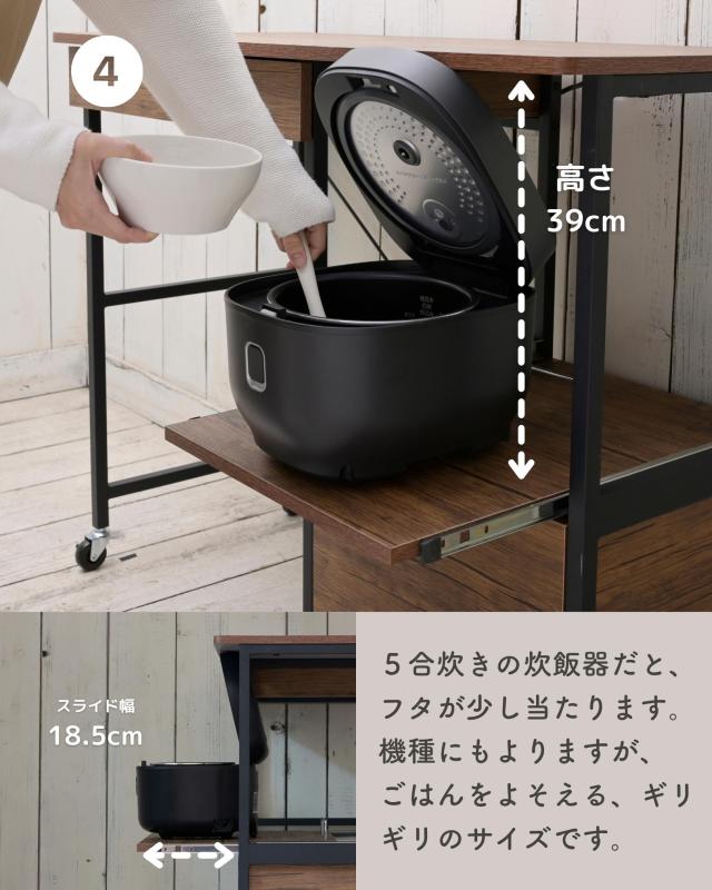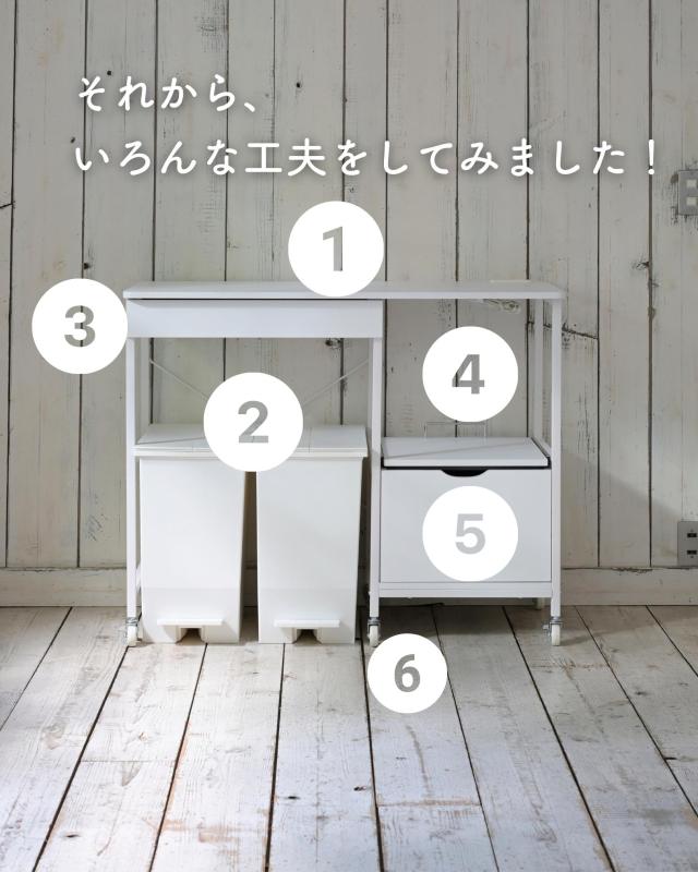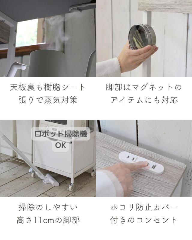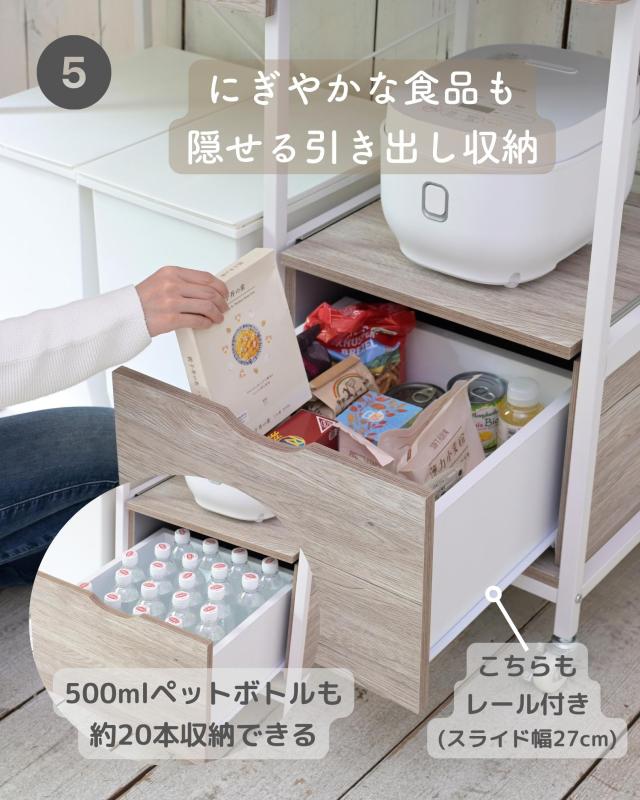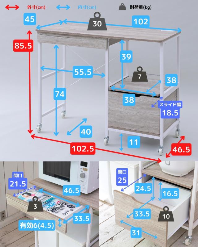 | 商品説明 | ●ゴミ箱上を活用する、しっかり頑丈なキッチンラック ●蓋付きゴミ箱も収納可能なサイズ設計 ●キッチンの高さに合わせやすいロータイプ ●天板ゆったり奥行き45cmで、大型レンジも設置可能 ●天板にはホコリ予防のコンセント付き(2口合計1500Wまで) ●水にも強いPVCで、作業台としても活躍 ●引出しはレール付きで、開け閉めラクラク ●オープン部は蒸気の出る家電も安心なスライド棚 ● 500mlペットボトルも収納できる、隠す引出し収納(レール付き) ●キャスター&脚長で、日ごろのお掃除もしやすい設計 ●動かしやすい単輪キャスター4個(うちストッパー付き2個) 【2023年11月1日より、従来品をモデルチェンジ】 ・縦長サイズから、圧迫感のないロータイプ&幅広サイズに ・ゴミ箱収納スペースに加え、浅型引出しを天板下に変更 ・キャスターにストッパーを追加 ・シンプルな白と、インテリアになじむ木目系の計3配色 ●天板サイズ: 幅102 奥行45cm ●コンセント位置:奥から3cm、右端から3.5cm ●引出し内寸: 幅46.5 奥行33.5 深さ4.5(有効高さ 6)、間口奥行21.5、スライド幅約27cm ●引出し下内寸:幅55.5 奥行40 高さ74cm ●スライド棚内寸:幅38 奥行37 高さ39、スライド幅約18.5cm ●下引出し内寸:幅31 奥行33.5 深さ16.5(有効内寸24.5)、スライド幅約27cm ●下部隙間:高さ11cm ●2口コンセント付属(合計1500Wまで)、コード長さ1.8m ●天板耐荷重: 30kg ●引出し耐荷重: 3kg ●スライド棚耐荷重: 7kg ●下引出し耐荷重: 10kg |