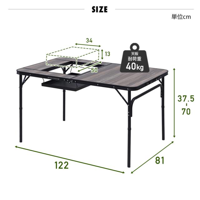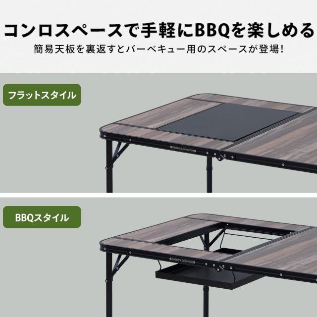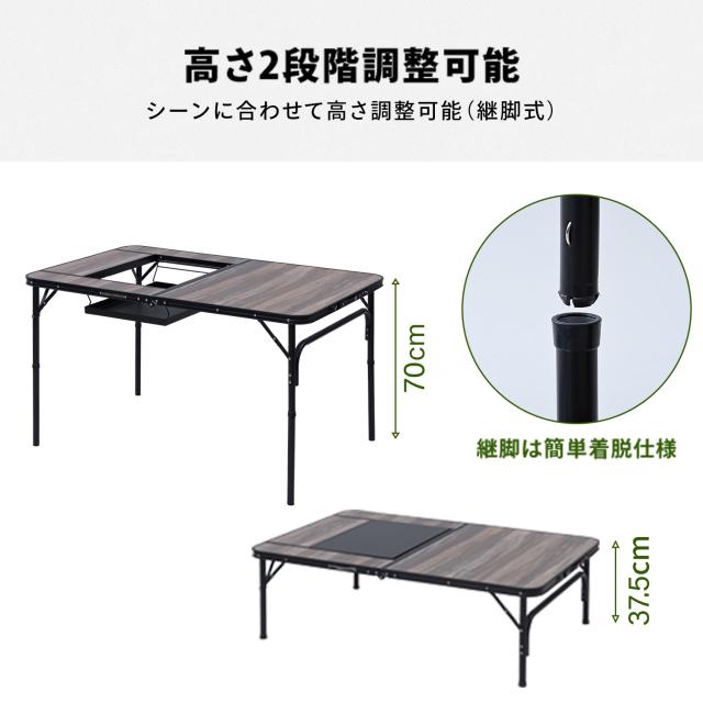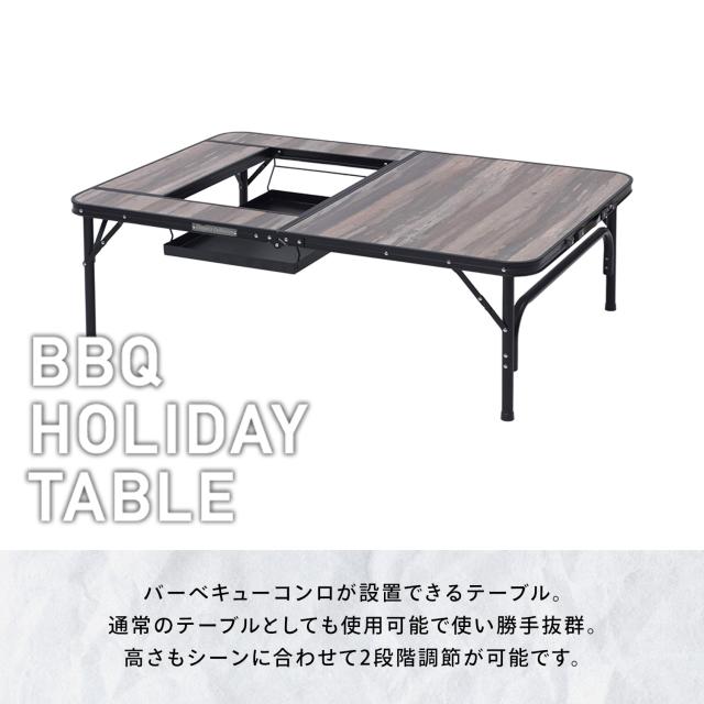 | 商品説明 | ●バーベキューコンロが設置できるテーブル ●通常のテーブルとしてもワイドに使用可能 ●バーベキューセットは天板を裏返すだけで簡単 ●テーブル高さは2段階に設定可能(37.5/70cm) ●サビに強く軽量なアルミフレーム採用 ●天板は丈夫な耐熱(150度)・耐滴加工 ●バーベキュー部 : 幅50 奥行34 深さ13cm ●天板耐荷重 : 40kg ●キャリーバッグ付き ●収納時サイズ : (BBT-1280)幅81 奥行62.5 高さ8cm ※この商品は、2024年9月20日よりヴィンテージダークウッド色を追加しました ※この商品は、2025年12月20日よりBBT-1880を追加しました |