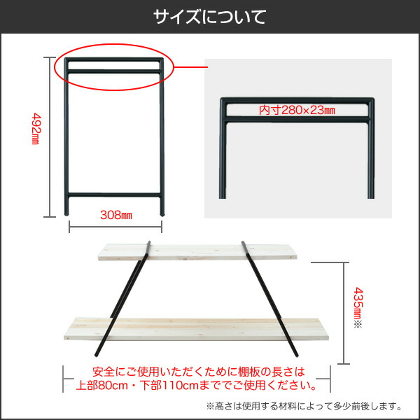 | 商品説明 | ●本製品は棚板として市販の木材(1×4材など)を別途ご購入いただく必要があります ※本製品のみではラックは完成しませんのでご注意ください ※本製品でラックを1台分作ることができます ●自分の好きな樹種・色合いの木材を組み合わせて自分好みのアイアンラックが作れます ●工具不要のカンタン組み立て ネジ、釘などは不要 板を挟んでハの字に開くだけでOK ●アウトドアにも最適 組立・分解が簡単なので持ち運びもラクラク ●置き場所を選ばないのでインテリアでもお庭でもどこでも使えます ●使わないときは分解してコンパクトに隙間収納 ※安全にご使用いただくために板材の長さは上部80cm、下部110cmまででご使用ください ●耐荷重の目安について 使用する木材、設置場所による影響が大きいため耐荷重の数値設定はしておりません 目安として使用する木材が荷重に耐えられると想定すると「上段:約10kg」「下段:約20kg」となります |