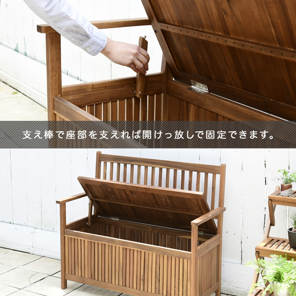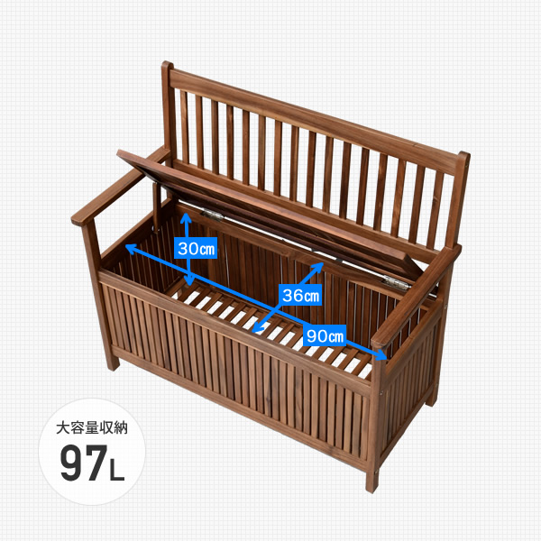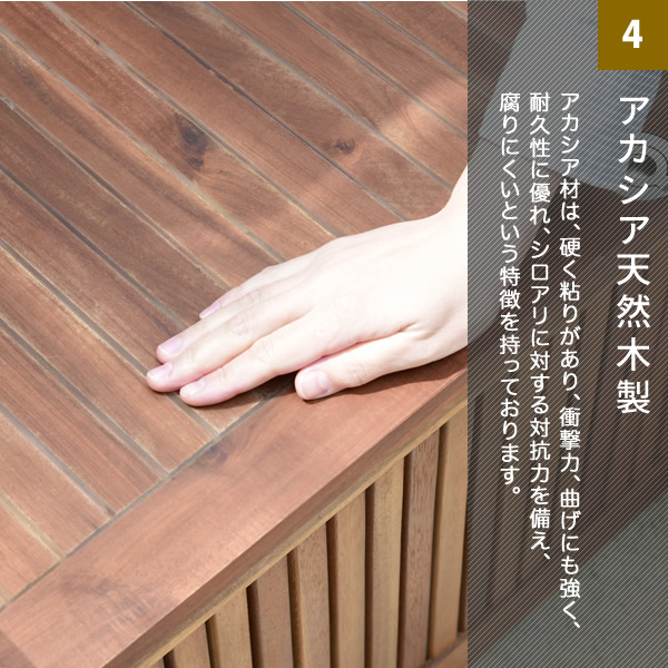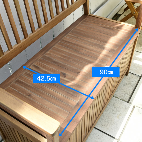 | 商品説明 | ●アカシア天然木のおしゃれなガーデン収納ベンチ ●ガーデニング用品、お掃除グッズ、洗濯用品、おもちゃなど、スッキリ収納できる ※防水仕様ではございません ●収納部は大容量97L 内寸:幅90×奥行36×高さ30cm ●収納部は開け閉めのしやすい取っ手付き ●天然木ならではの風合いでお庭にマッチします ●大人2人がゆったり座れる設計でガーデンベンチとしても申し分ありません ●座面高さ:44cm ●メンテナンス:木の表面を乾燥やひび割れから守り、木の内部に湿気が侵入するのを防ぐため、定期的に(年に1、2回程度)ステインを塗り直してください |