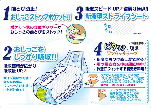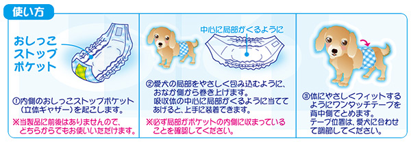 | 商品説明 | ●小型犬代表犬種:チワワ(大きめの子)、ヨークシャーテリア(大きめの子)、マルチーズ、パピヨン、トイプードル、シーズー、ミニチュアダックスフンドなど ※愛犬の成長・体型・尿量・用途に合わせてご使用ください ●マーキング対策、おもらし、おでかけ、介護に! ●ピタッと装着ワンタッチテープで何度でもつけ直し可能!体型にフィットする構造を実現! ●ポケット状の立体ギャザーがおしっこの前とびをストップ ●サイズ調節が可能!様々な体型のわんちゃんにお使い頂けます ●従来品より吸収面積が広がり、吸収量アップ ●吸収スピードアップ、逆戻り極小 ※必ず愛犬のウエストサイズを御確認の上、お買い求めください |