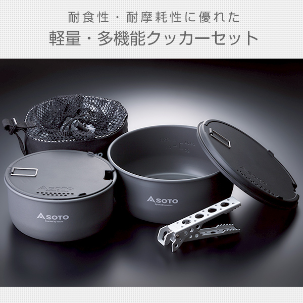 | 商品説明 | ●耐食性・耐磨耗性に優れた軽量・多機能クッカー ●一般的なアルマイト加工より皮膜の厚い「スーパーアナダイズド加工」を採用耐衝撃性、耐食性にも優れる ●保温力を高めるコジー、様々な使い方ができるリッド(フタ)、トングとしても使えるリフターなど機能性も多様なクッカーセット |