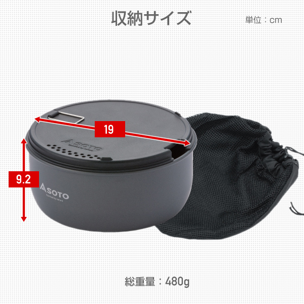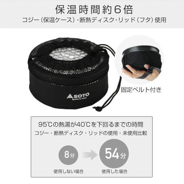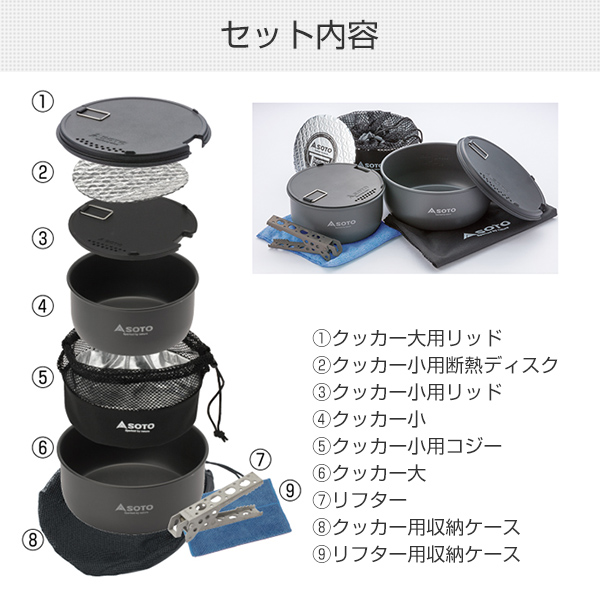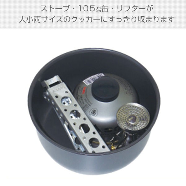 | 材質 | クッカー・リフター:アルミニウム、リッド:樹脂、クッカー小用断熱ディスク:樹脂・アルミニウム、クッカー用リッド:材質、クッカー小用コジー:アルミニウム(内側)・ナイロン(外側)、収納ケース:ナイロン、リフター用収納ケース:綿 |
