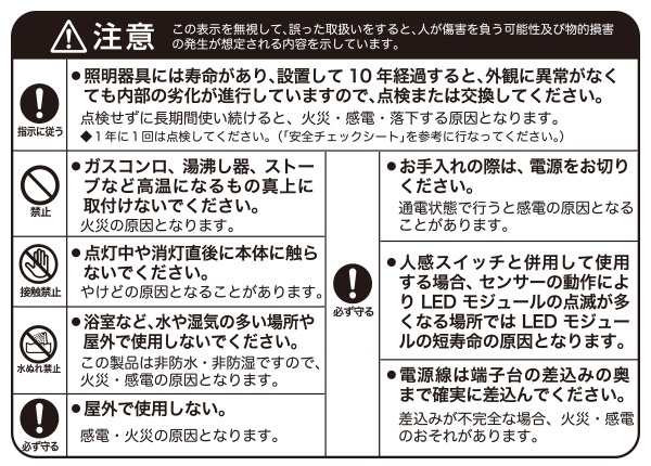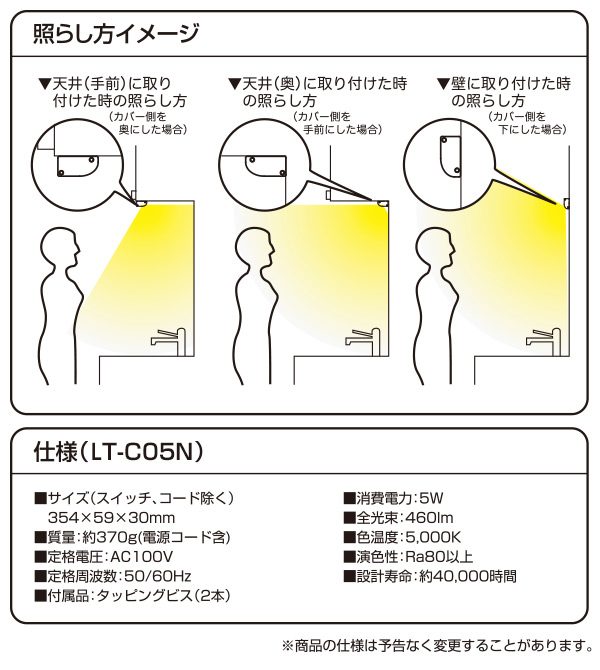 | 商品説明 | ●電源:AC100V(50/60Hz) ●消費電力:5W ●全光束:460lm ●色温度:5000K ●演色性:Ra80以上 ●センサー感知距離:約5cm ●設計寿命:約40,000時間 ●使用温度:5〜30℃ ●コンセントでも壁配線でも使用可能 ●接近センサー搭載で手をかざすだけで点灯・消灯 ●天井、壁面にネジで簡易取り付け ●付属品:タッピングビス×2 ●メーカー保証:1年 ●12個セット |