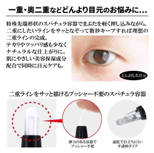 | 使用方法 | 容器後部にあるダイヤルを液が出るまでゆっくり回します。液が出すぎた場合はティッシュなどでふき取ってください。 二重にしたいラインに先端部をゆっくりとまぶたに軽く押すように沿ってください。 目尻までラインを引いたら10秒程キープして離してください。使用後はキャップを上側に立てて保管してください。 |