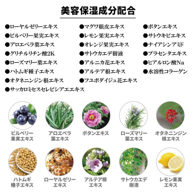 | 成分 | エ タノール、(アクリル酸アルキル/ジアセトンアクリルアミド)コポリマーAMP、水、BG、ヒアルロン酸Na、水溶性コラーゲン、プラセンタエキス、グリ チルリチン酸2K、ナイアシンアミド、ローヤルゼリーエキス、アロエベラ葉エキス、ローズマリー葉エキス、アルニカ花エキス、フユボダイジュ花エキス、ア ルテア根エキス、オタネニンジン根エキス、マグワ根皮エキス、ハトムギ種子エキス、サトウカエデ樹液、サトウキビエキス、オレンジ果実エキス、ビルベリー 果実エキス、レモン果実エキス、サッカロミセスセレビシアエエキス、ボタンエキス、ソルビトール、グリセリン、ペンチレングリコール |