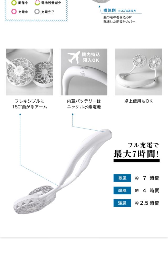 | 連続使用時間 | 強風:約2.5時間、弱風:約4時間、微風:約7時間 |