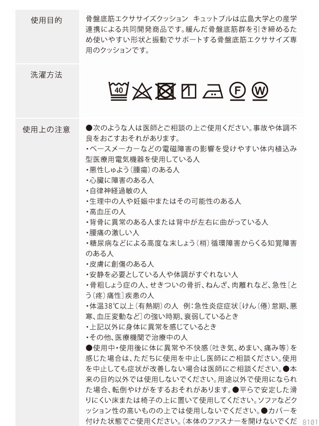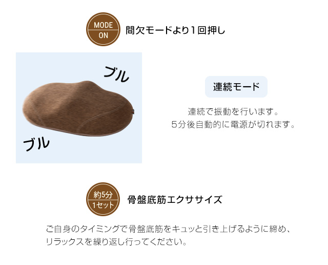 振動ユニットを搭載した骨盤底筋エクササイズのための専用クッションです。振動に合わせて尿道周りの筋肉を引き上げるように力を入れるエクササイズを行うことで、骨盤底筋群に効果的なエクササイズが可能になります。快適な生活を送るために必要な骨盤底筋群のエクササイズを簡単&効果的に行うことが出来るクッションです。お尻に優しくフィットする低反発素材採用。骨盤底筋群のエクササイズに適した3D立体形状。1秒間に40回の振動がエクササイズを適切にサポート。振動モードは「間欠モード」と「連続モード」の2種類。カバーは取り外して洗濯することが出来ます。※広島大学共同研究商品。※悩めるモニター7名全員が効果を実感しました。 【カラー】ブラウン、グリーン 【商品サイズ】W41×D28×H14cm(椅子におさまるちょうど良いサイズ) 【電源種類】単3アルカリ乾電池4本(別売)