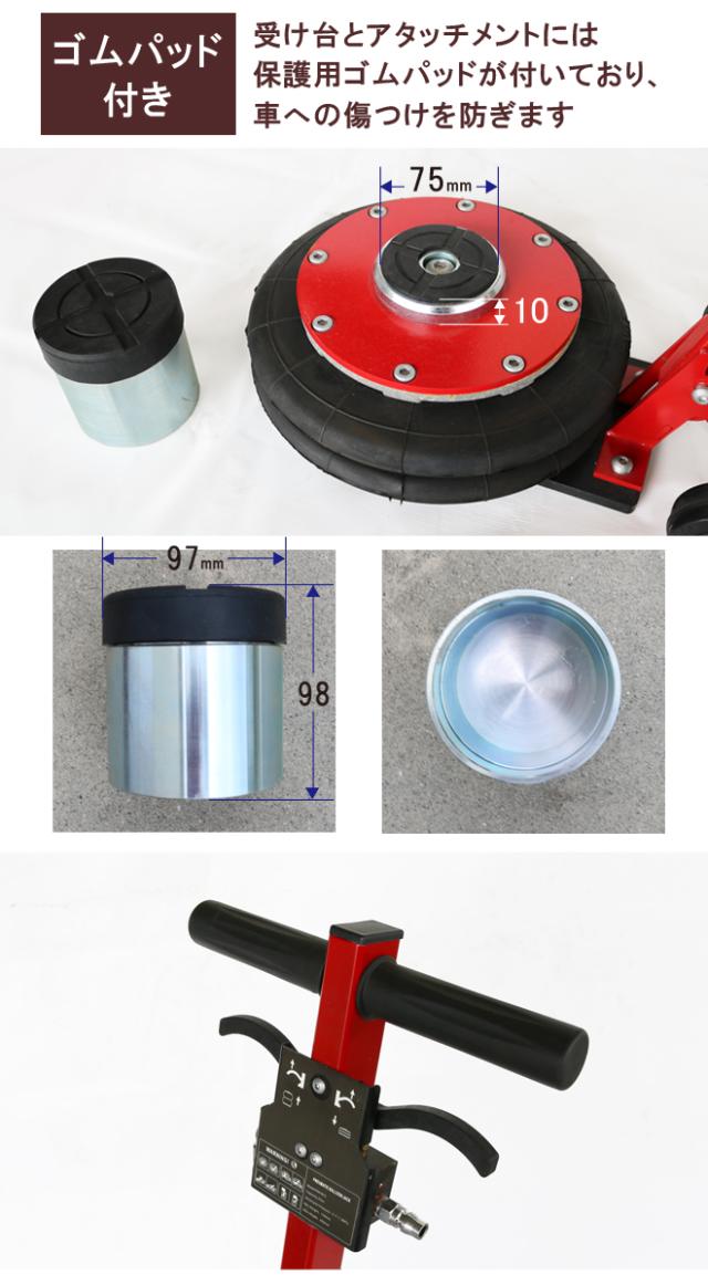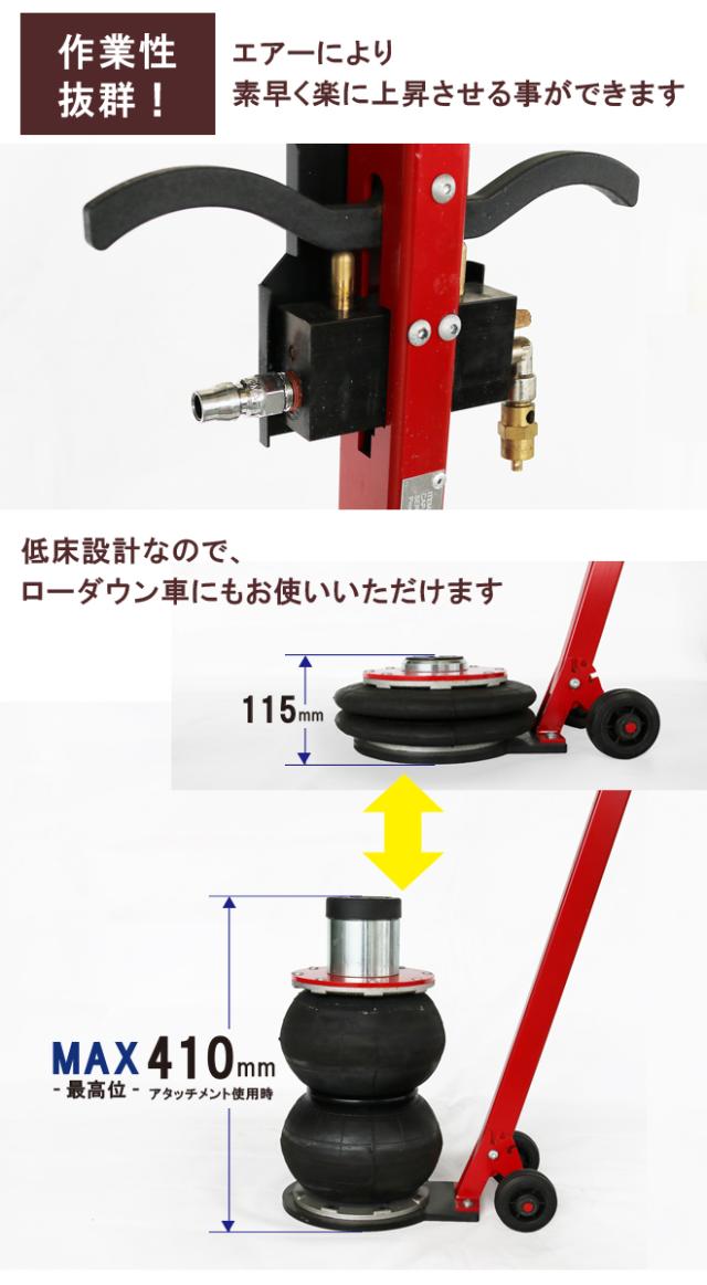 | 受け台高さ | 最低位 115mm 最高位 330mm(アタッチメント使用時/410mm) ※エアー圧力1.0Mpaの場合 |