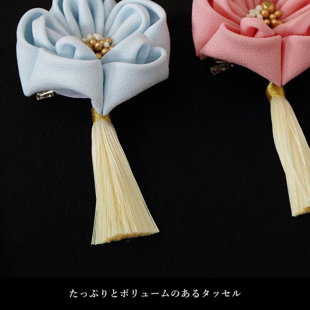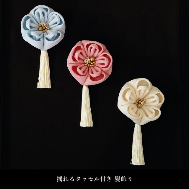 ピンク・ホワイト・ブルーのつまみ細工の花飾りに、ボリュームたっぷりの揺れるタッセル付き髪飾りです。