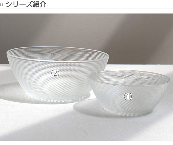 ![]() (1)あられガラスボウル 13cm | ![]() (2)あられガラスボウル 18cm |