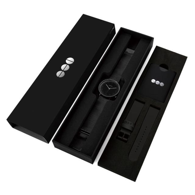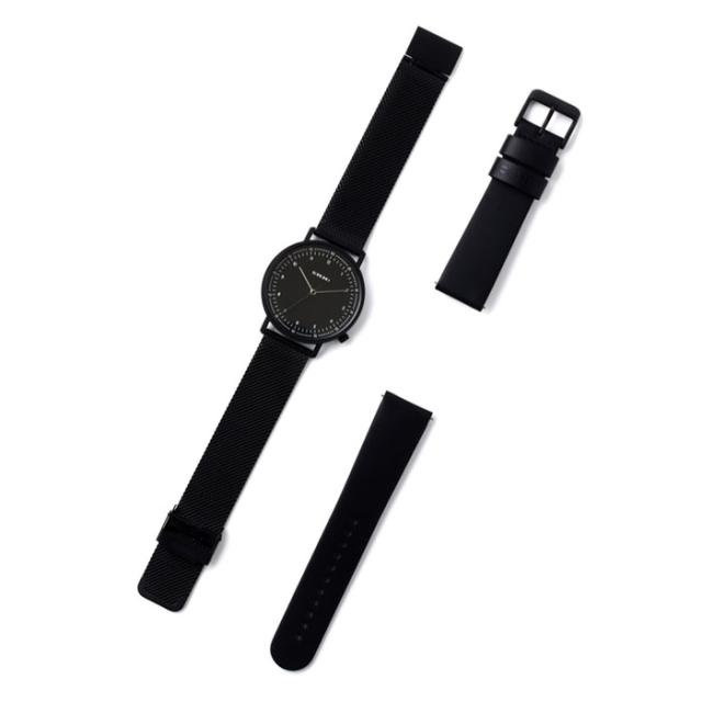 | KOMONO(コモノ)はAnton Janssens(アントン・ジャンセンス)、Raf Maes(ラフ・マエス)という二人のデザイナーによって、ベルギーで2009年に設立されたアクセサリーブランドです。ブランド名の「KOMONO」は、日本語の「小物」からインスパイアされた造語で、その言葉の持つ多様性の通り老若男女の全ての人々にアピール出来るアクセサリーブランドとして、時計とサングラスをメインにして展開しています。また、KOMONO(コモノ)のデザインコンセプトはクラシックとモダンを融合させたシンプルでいて時代性を感じさせるデザインです。 クリスマス限定ボックスは女性向けの「FOR HER」と男性向けの「FOR HIM」の2種類で展開される。「FOR HIM」は、文字盤・ケース・ベルトと全てのパーツがマットブラックで統一された腕時計LEWISと替えベルトがセットに。レザーとステンレスメッシュの2ベルトもオールブラックに拘りぬいた。腕時計にはワンタッチレバーが搭載されており、ベルトの付け替えが容易に。その日の気分やスタイルに合わせてベルトを自在にカスタマイズできるのが魅力。ミニマルでシンプル、洗練された男前ブラックウォッチに仕上がっている。