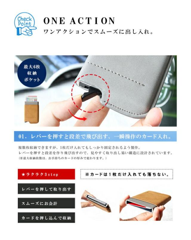 レバーをスライドすることでワンタッチでカードを取り出すことができます。階段式に飛び出すので、使うカードを見つけやすく瞬時に見分けることができます。カードを戻す場合も飛び出たカードを押し込むだけで簡単です。