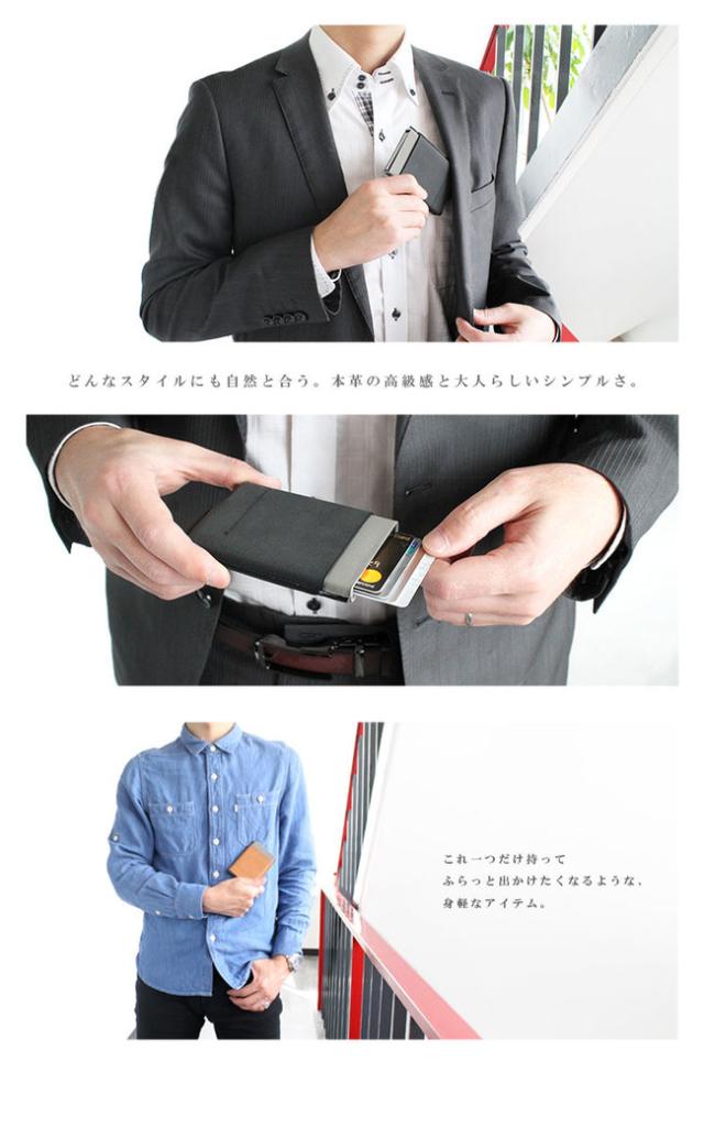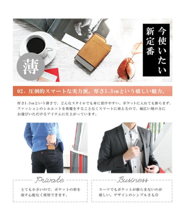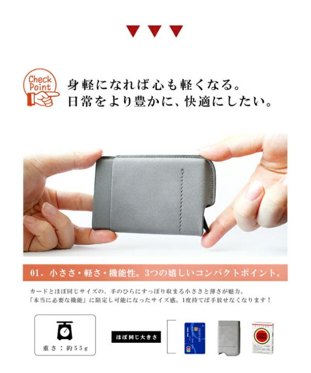 スライド式カードケースには約6枚のカードが収納でき、外側には2つのポケットがあります。大きい財布を持ちたくないミニマリストの方にもおすすめです。