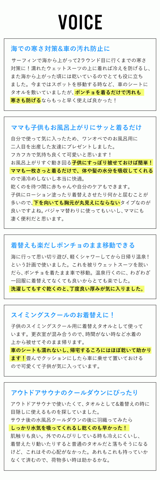 肌触りが良く吸水性に優れたマイクロファイバー生地を使用。抜群の着心地なのでレジャーだけでなく、普段のお風呂上りなどにも利用できます。