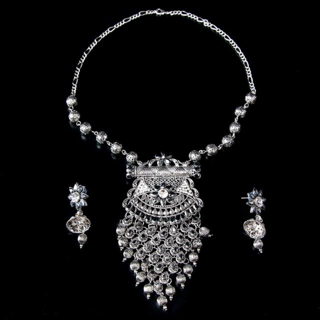 ラバリ族デザイン トライバル・シルバーメタル ネックレス&ピアスセット / ネックレス、ピアス、アクセサリー、アクセサリーセット、パーティー、結婚式、婚礼用、サリー、パンジャビドレス、ベリーダンス アクセ 【インドとアジアのアクセサリー